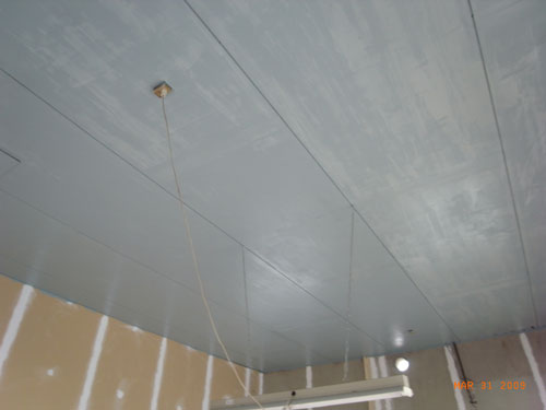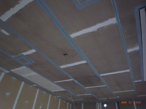 天井塗装。目地の部分を脚立を使ってハケ塗り。