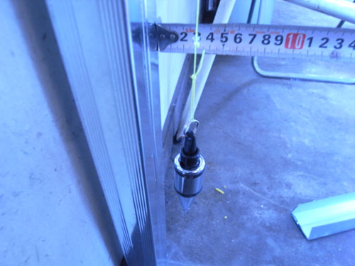 ちょうど、床から天井までの長さに切った軽量鉄骨を ブラ(垂直を出す道具)を使って、軽量鉄骨で垂直をみます。